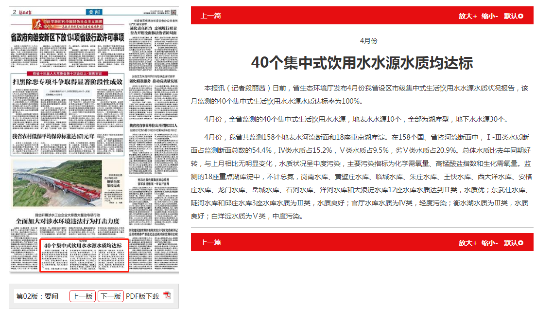 4月份,全省监测的40个集中式生活饮用水水源,地表水水源10个,全部为湖库型,地下水水源30个。