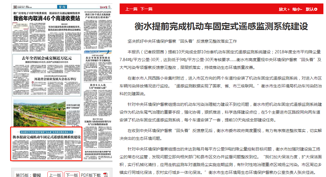 针对中央环境保护督察组提出的机动车污染治理能力建设不到位问题,衡水市把机动车固定式遥感监测系统建设作为机动车尾气治理的重要手段,强化协调,狠抓推进,科学选择建设点位,在5个主要进市区路段同向两车道安装了机动车固定式遥感监测系统,每个车道安装了一套,提前10天完成全部建设任务。