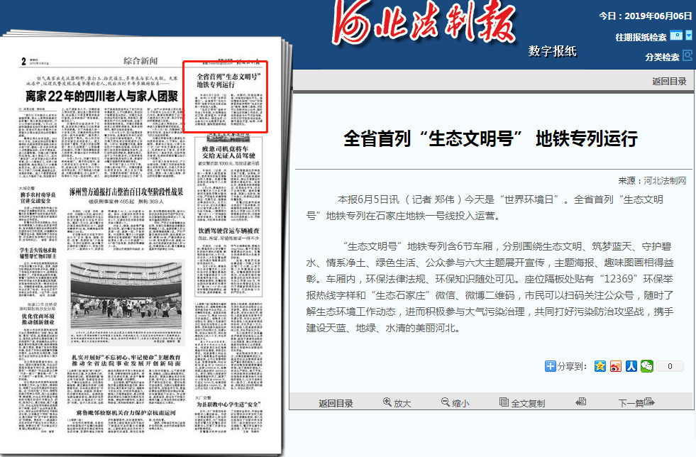 本报6月5日讯 (记者 郑伟)今天是“世界环境日”。全省首列“生态文明号”地铁专列在石家庄地铁一号线投入运营。