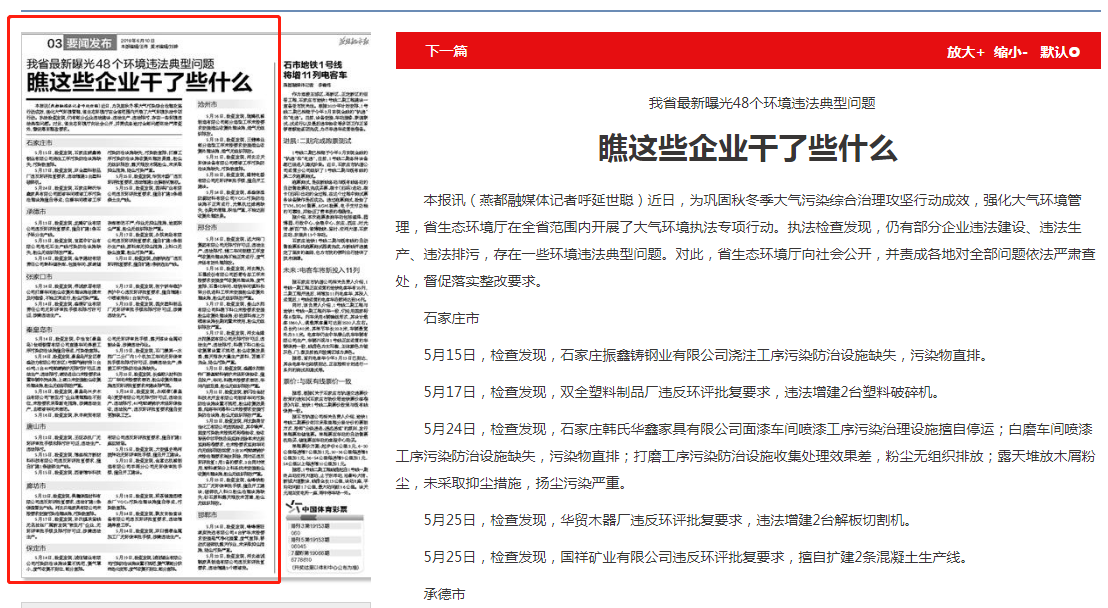 5月12日,检查发现,昊鹰保温材料有限公司违反环评批复要求,违法扩建1条保温管生产线。河北贝格家具有限公司未按要求安装污染治理设施,污染物直排。