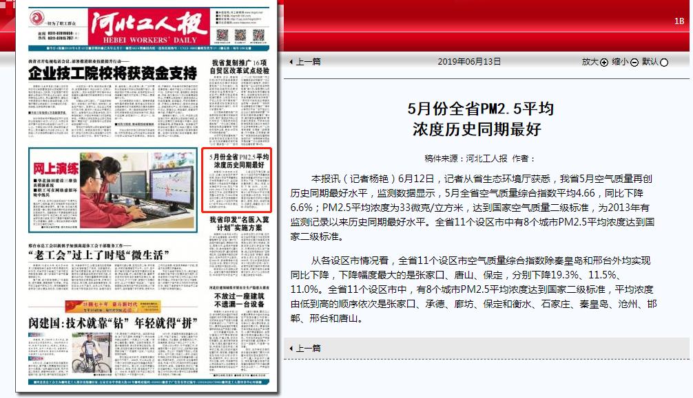 获悉,我省5月空气质量再创历史同期最好水平,监测数据显示,5月全省空气质量综合指数平均4.66,同比下降6.6%;PM2.5平均浓度为33微克/立方米,达到国家空气质量二级标准,为2013年有监测记录以来历史同期最好水平。全省11个设区市中有8个城市PM2.5平均浓度达到国家二级标准。 从各设区市情况看,全省11个设区市空气质量综合指数除秦皇岛和邢台外均实现同比下降,下降幅度最大的是张家口、唐山、保定,分别下降19.3%、11.5%、11.0%。全省11个设区市中,有8个城市PM2.5平均浓度达到国家二级标准,平均浓度由低到高的顺序依次是张家口、承德、廊坊、保定和衡水、石家庄、秦皇岛、沧州、邯郸、邢台和唐山。