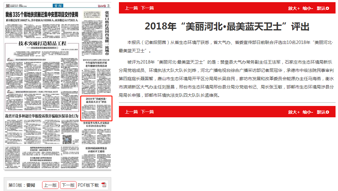被评为2018年“美丽河北·最美蓝天卫士”的是:赞皇县大气办常务副主任王法军,石家庄市生态环境局新乐分局党组成员、环境执法大队大队长刘烨,河北广播电视台综合广播采访部记者屈冠华,承德市中级人民法院民事审判第四庭庭长聂国智,唐山市生态环境局开平区分局局长吴自民,廊坊市发展和改革委员会能源办主任马海燕,衡水市滨湖新区大气办主任刘振昌,邢台市生态环境局邢台县分局分党组书记、局长张玉敏,邯郸市生态环境局涉县分局局长申强,邯郸市环境执法支队四大队队长孟维亮。