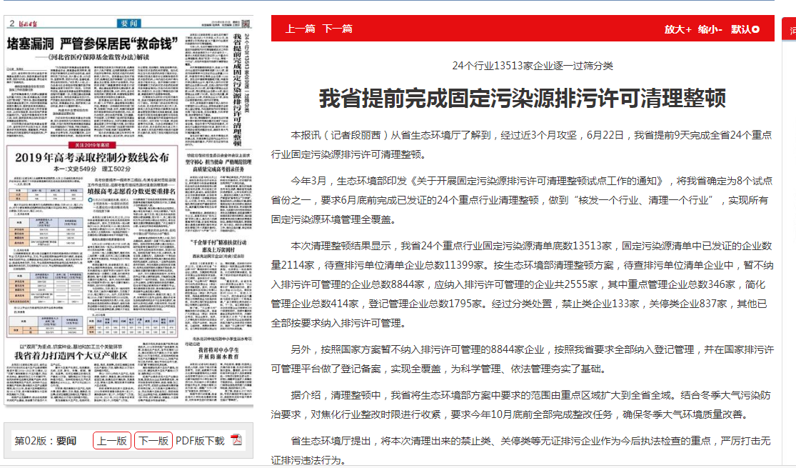 河北日报:24个行业13513家企业逐一过筛分类 我省提前完成固定污染源排污许可清理整顿