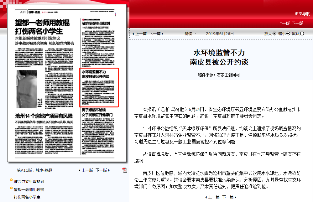 第五环境监察专员办公室就沧州市南皮县水环境监管中存在的问题,约谈了南皮县政府主要负责同志。 针对环保公益组织“天津绿领环保”所反映问题,约谈会上通报了现场调查情况的南皮县存在对入河排污企业监管不严、河流治理力度不足、津德路东沟水质多次超标、河道周边生活垃圾及一般工业固废管控不到位等问题。 从调查情况看,“天津绿领环保”反映问题属实,南皮县在水环境监管上确实存在漏洞。 南皮县区位敏感,域内大浪淀水库为沧州市重要的集中式饮用水水源地,水污染防治工作应更为重视。约谈会要求南皮县要找准污染源头,分析原因,尤其是查找生态环境部门自身原因;加大整改力度,严肃责任追究,把责任追准追到位。