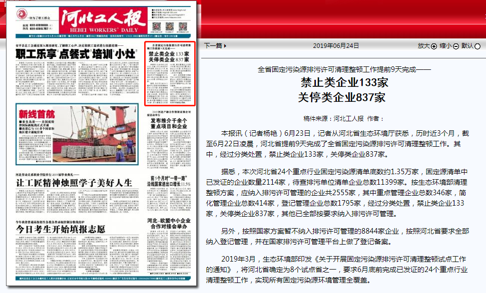 获悉,历时近3个月,截至6月22日凌晨,河北省提前9天完成了全省固定污染源排污许可清理整顿工作。其中,经过分类处置,禁止类企业133家,关停类企业837家。