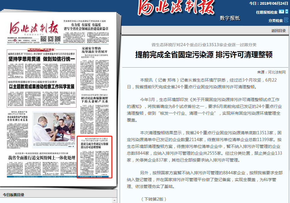 今年3月,生态环境部印发《关于开展固定污染源排污许可清理整顿试点工作的通知》,将我省确定为8个试点省份之一,要求6月底前完成已发证的24个重点行业清理整顿,做到“核发一个行业、清理一个行业”,实现所有固定污染源环境管理全覆盖。