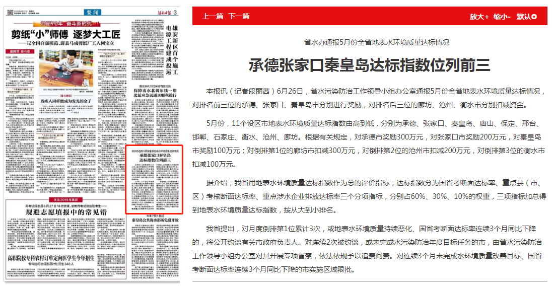 本报讯(记者段丽茜)6月26日,省水污染防治工作领导小组办公室通报5月份全省地表水环境质量达标情况,对排名前三位的承德、张家口、秦皇岛市分别进行奖励,对排名后三位的廊坊、沧州、衡水市分别扣减资金。