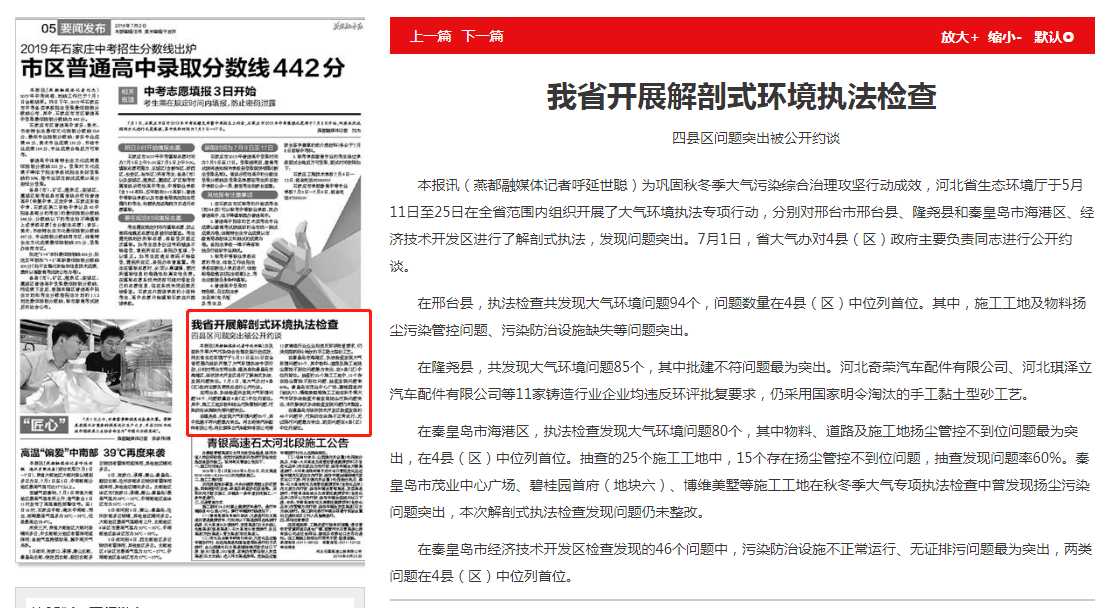 本报讯(燕都融媒体记者呼延世聪)为巩固秋冬季大气污染综合治理攻坚行动成效,东京热 于5月11日至25日在全省范围内组织开展了大气环境执法专项行动,分别对邢台市邢台县、隆尧县和秦皇岛市海港区、经济技术开发区进行了解剖式执法,发现问题突出。7月1日,省大气办对4县(区)政府主要负责同志进行公开约谈。