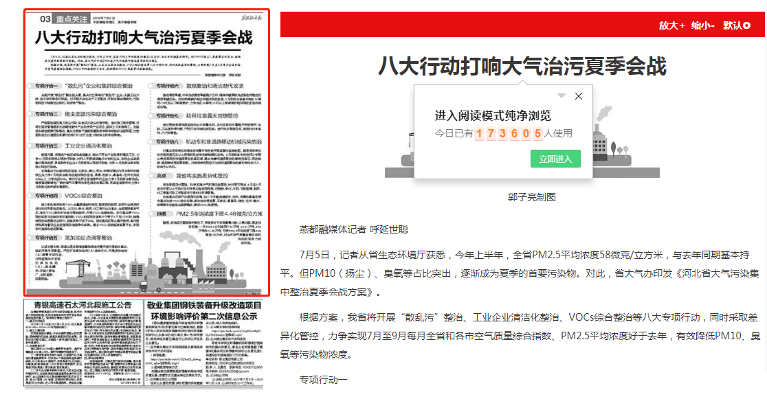 根据方案,我省将开展“散乱污”整治、工业企业清洁化整治、VOCs综合整治等八大专项行动,同时采取差异化管控,力争实现7月至9月每月全省和各市空气质量综合指数、PM2.5平均浓度好于去年,有效降低PM10、臭氧等污染物浓度。