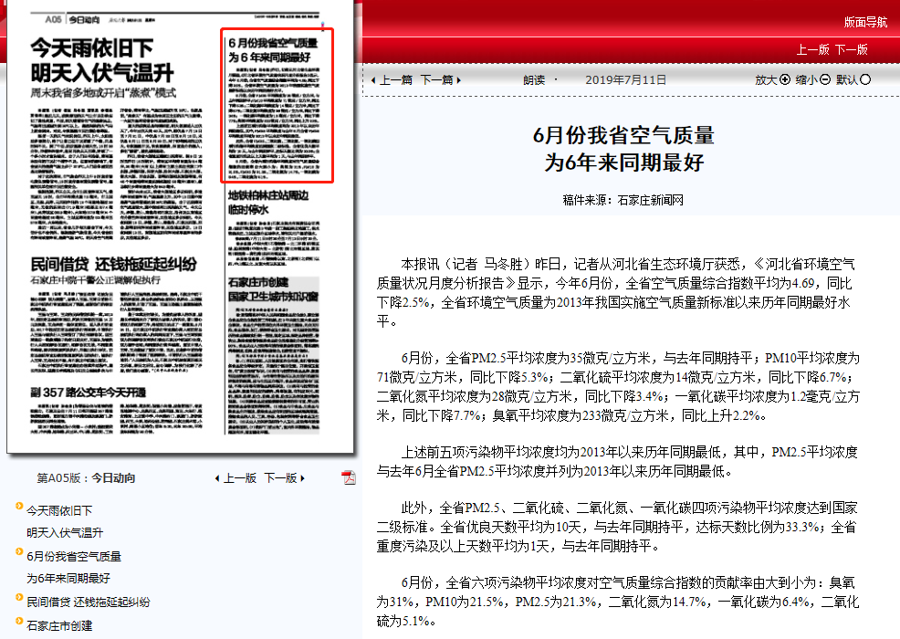获悉,《河北省环境空气质量状况月度分析报告》显示,今年6月份,全省空气质量综合指数平均为4.69,同比下降2.5%,全省环境空气质量为2013年我国实施空气质量新标准以来历年同期最好水平。 6月份,全省PM2.5平均浓度为35微克/立方米,与去年同期持平;PM10平均浓度为71微克/立方米,同比下降5.3%;二氧化硫平均浓度为14微克/立方米,同比下降6.7%;二氧化氮平均浓度为28微克/立方米,同比下降3.4%;一氧化碳平均浓度为1.2毫克/立方米,同比下降7.7%;臭氧平均浓度为233微克/立方米,同比上升2.2%。 上述前五项污染物平均浓度均为2013年以来历年同期最低,其中,PM2.5平均浓度与去年6月全省PM2.5平均浓度并列为2013年以来历年同期最低。 此外,全省PM2.5、二氧化硫、二氧化氮、一氧化碳四项污染物平均浓度达到国家二级标准。全省优良天数平均为10天,与去年同期持平,达标天数比例为33.3%;全省重度污染及以上天数平均为1天,与去年同期持平。 6月份,全省六项污染物平均浓度对空气质量综合指数的贡献率由大到小为:臭氧为31%,PM10为21.5%,PM2.5为21.3%,二氧化氮为14.7%,一氧化碳为6.4%,二氧化硫为5.1%。