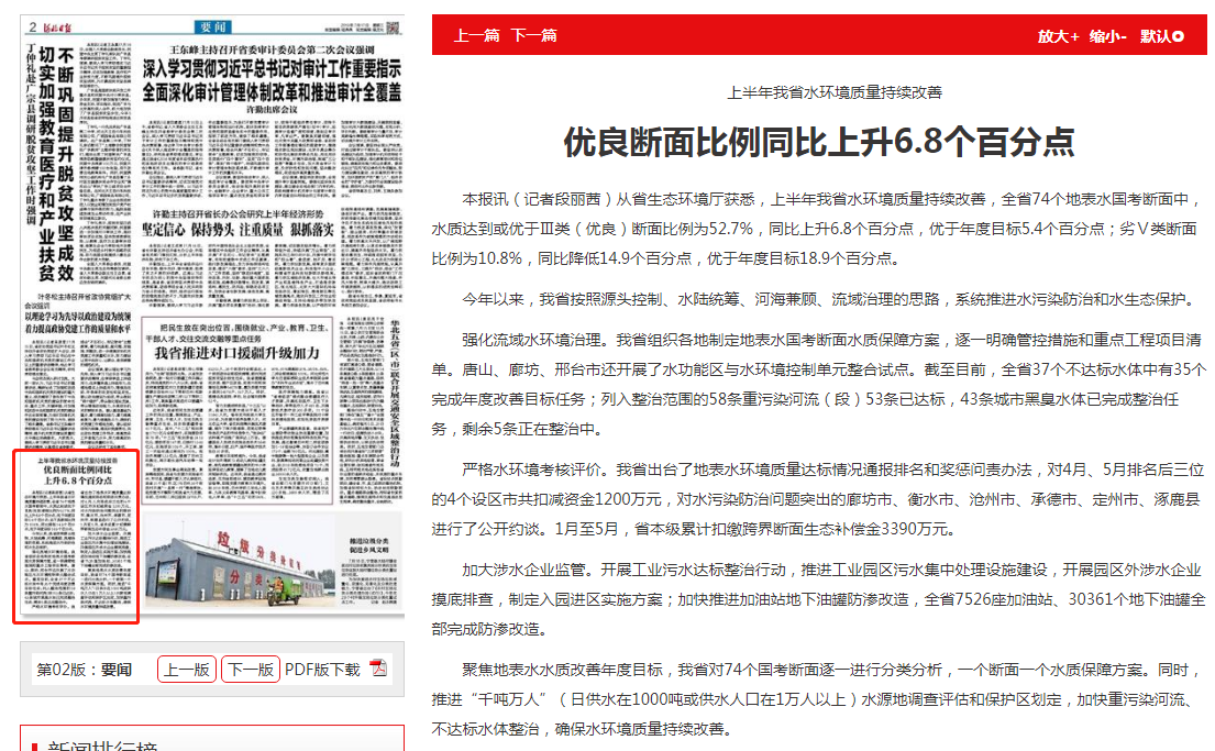 严格水环境考核评价。我省出台了地表水环境质量达标情况通报排名和奖惩问责办法,对4月、5月排名后三位的4个设区市共扣减资金1200万元,对水污染防治问题突出的廊坊市、衡水市、沧州市、承德市、定州市、涿鹿县进行了公开约谈。1月至5月,省本级累计扣缴跨界断面生态补偿金3390万元。