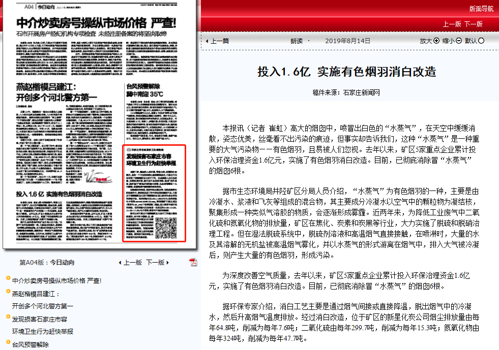 本报讯(记者 崔虹)高大的烟囱中,喷冒出白色的“水蒸气”,在天空中缓缓消散,姿态优美,丝毫看不出污染的痕迹,但事实却告诉我们,这种“水蒸气”是一种重要的大气污染物——有色烟羽,且易被人们忽视。去年以来,矿区5家重点企业累计投入环保治理资金1.6亿元,实施了有色烟羽消白改造。目前,已彻底消除冒“水蒸气”的烟囱6根。 据市生态环境局井陉矿区分局人员介绍,“水蒸气”为有色烟羽的一种,主要是由冷凝水、浆液和飞灰等组成的混合物,其主要成分冷凝水以空气中的颗粒物为凝结核,聚集形成一种类似气溶胶的物质,会逐渐形成雾霾。近两年来,为降低工业废气中二氧化硫和氮氧化物的排放量,矿区在焦化、炭素和炭黑等行业,大力实施了脱硫和脱硝治理工程。但在湿法脱硫系统中,脱硫剂溶液和高温烟气直接接触,在喷淋时,大量的水及其溶解的无机盐被高温烟气雾化,并以水蒸气的形式游离在烟气中,排入大气被冷凝后,则产生大量的有色烟羽,形成污染。 为深度改善空气质量,去年以来,矿区5家重点企业累计投入环保治理资金1.6亿元,实施了有色烟羽消白改造。目前,已彻底消除冒“水蒸气”的烟囱6根。 据环保专家介绍,消白工艺主要是通过烟气间接或直接降温,脱出烟气中的冷凝水,然后升高烟气温度排放。经过消白改造,位于矿区的新星化炭公司烟尘排放量由每年64.8吨,削减为每年7.6吨;二氧化硫由每年299.7吨,削减为每年15.3吨;氮氧化物由每年324吨,削减为每年47.7吨。
