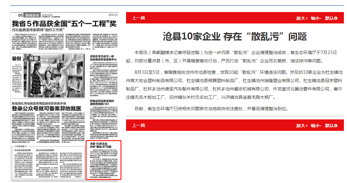 8月3日至5日,省暗查组在沧州市沧县检查,发现10起“散乱污”环境违法问题。涉及的10家企业为杜生镇沧州高大宏业塑料制品有限公司、杜生镇沧县辉腾塑料制品厂、杜生镇沧州瑞隆塑业有限公司、杜生镇沧县冠宇塑料制品厂、杜林乡沧州德圣汽车配件有限公司、杜林乡沧州睿志机械有限公司、仵龙堂河北冀沧管件有限公司、崔尔庄镇无名木板加工厂、旧州镇东关村无名加工厂、兴济镇沧县连喜毛刷木柄厂。