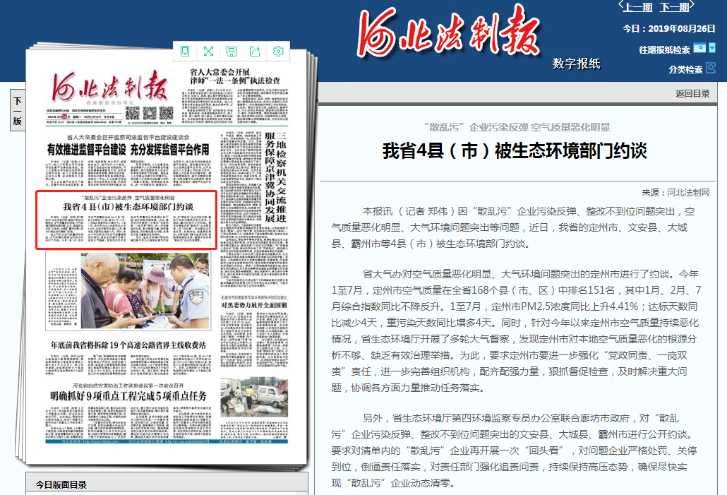 本报讯 (记者 郑伟)因“散乱污”企业污染反弹、整改不到位问题突出,空气质量恶化明显、大气环境问题突出等问题,近日,我省的定州市、文安县、大城县、霸州市等4县(市)被生态环境部门约谈。