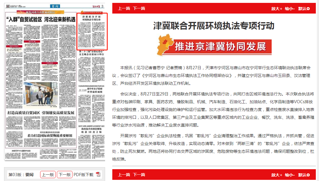 本报讯(见习记者曹思宁 记者贾楠)8月27日,天津市宁河区与唐山市在宁河举行生态环境联动执法联席会议,会议签订了《宁河区与唐山市生态环境执法工作协同框架协议》,并建立宁河区与唐山市玉田县、汉沽管理区、芦台经济开发区环境执法联动工作机制。