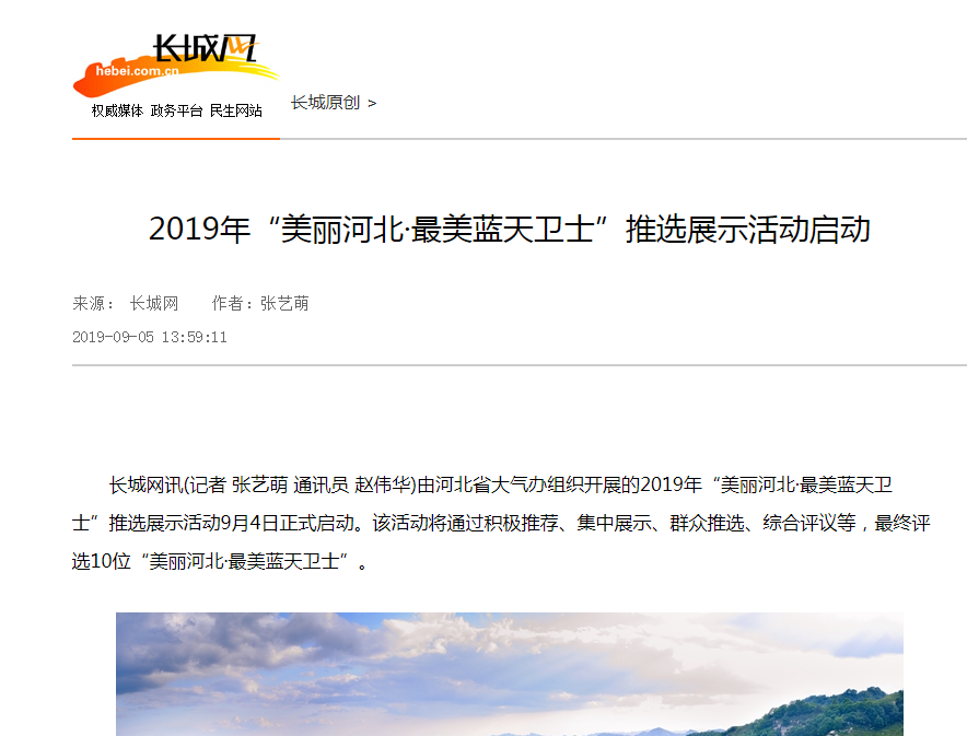长城网讯(记者 张艺萌 通讯员 赵伟华)由河北省大气办组织开展的2019年“美丽河北·最美蓝天卫士”推选展示活动9月4日正式启动。该活动将通过积极推荐、集中展示、群众推选、综合评议等,最终评选10位“美丽河北·最美蓝天卫士”。