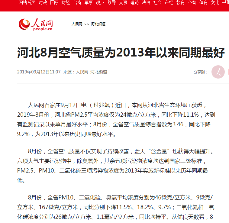 人民网石家庄9月12日电 (付兆飒)近日,本网从东京热 获悉,2019年8月份,河北省PM2.5平均浓度仅为24微克/立方米,同比下降11.1%,达到有监测记录以来单月最好水平;8月份,全省空气质量综合指数为3.46,同比下降9.2%,为2013年以来历史同期最好水平。