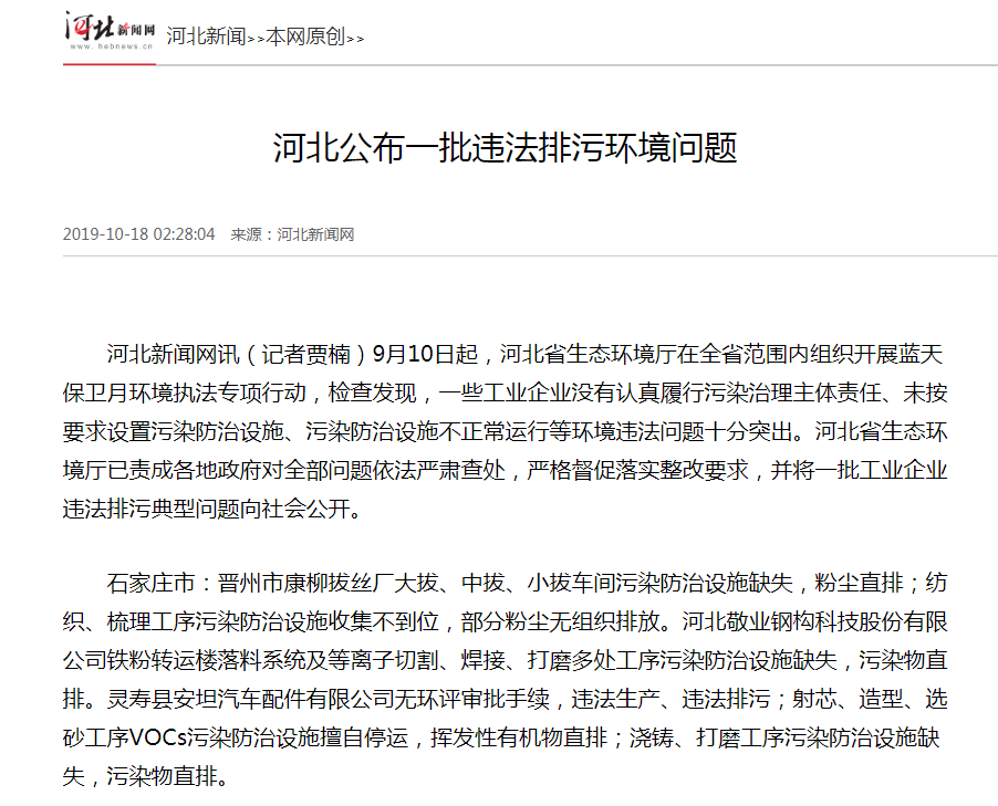 石家庄市:晋州市康柳拔丝厂大拔、中拔、小拔车间污染防治设施缺失,粉尘直排;纺织、梳理工序污染防治设施收集不到位,部分粉尘无组织排放。河北敬业钢构科技股份有限公司铁粉转运楼落料系统及等离子切割、焊接、打磨多处工序污染防治设施缺失,污染物直排。灵寿县安坦汽车配件有限公司无环评审批手续,违法生产、违法排污;射芯、造型、选砂工序VOCs污染防治设施擅自停运,挥发性有机物直排;浇铸、打磨工序污染防治设施缺失,污染物直排。