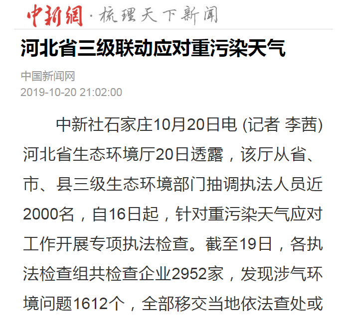 据介绍,河北省为推动各项应急减排措施落地落实,省、市、县三级联动共同应对重污染天气,各市在发布预警同时,组织执法人员开展多种形式执法检查,通过晨查夜查、巡回执法,交叉执法、远程执法等多手段多措施,督导企业、施工工地等单位严格按照“一厂一策”应急预案落实应急减排措施。