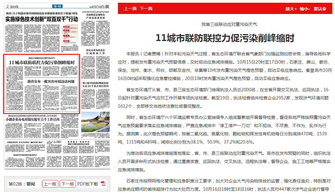 省、市、县三级执法联动,11城市开展联防联控,有效降低了重污染天气期间污染峰值,缩短了污染时长。省环境应急与重污染天气预警中心初步监测数据显示,自15日0时至19日24时,全省11个设区市累计出现重度及以上污染时长为45小时,较预测的减少236小时。