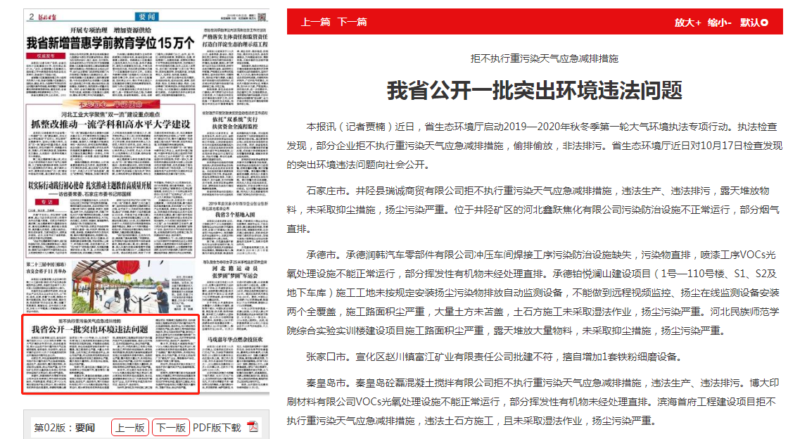 石家庄市。井陉县瑞诚商贸有限公司拒不执行重污染天气应急减排措施,违法生产、违法排污,露天堆放物料,未采取抑尘措施,扬尘污染严重。位于井陉矿区的河北鑫跃焦化有限公司污染防治设施不正常运行,部分烟气直排。