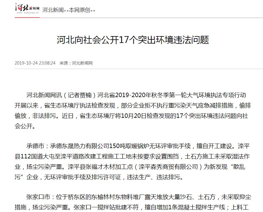 承德市:承德东晟热力有限公司150吨取暖锅炉无环评审批手续,擅自开工建设。滦平县112国道大屯至滦平道路改建工程施工工地未按要求设置围挡,土石方施工未采取湿法作业,扬尘污染严重。滦平县张福才木材加工点(滦平森秀商贸有限公司)为新发现“散乱污”企业,无环评审批手续及排污许可证,违法生产、违法排污。