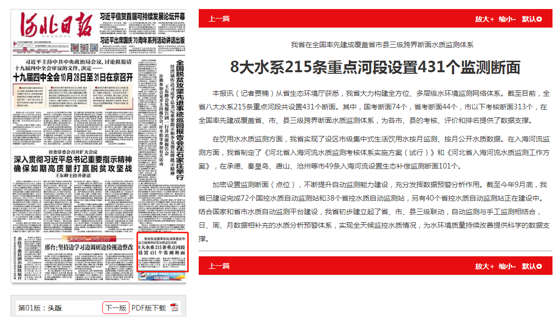 在饮用水水质监测方面,我省实现了设区市级集中式生活饮用水按月监测、按月公开水质数据。在入海河流监测方面,我省制定了《河北省入海河流水质监测考核体系实施方案(试行)》和《河北省入海河流水质监测工作方案》,在承德、秦皇岛、唐山、沧州等市49条入海河流设置生态补偿监测断面101个。