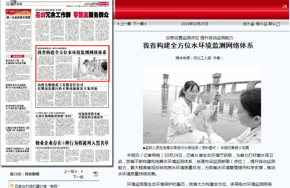 环境监测是生态环境保护的基石,我省大力构建全方位、多层级水环境监测网络体系。截至目前,全省八大水系215条重点河段共设置431个断面,其中,国考断面74个,省考断面44个,市以下考核断面313个,在全国率先建成覆盖省、市、县三级跨界断面水质监测体系的同时,也为各市、县的考核、评价和排名提供了数据支撑。在饮用水水质监测方面,实现了地市级集中式生活饮用水按月监测、按月公开水质数据。在入海河流监测方面,制定了《河北省入海河流水质监测考核体系实施方案(试行)》和《河北省入海河流水质监测工作方案》,在承德、秦皇岛、唐山、沧州市49条入海河流设置生态补偿监测断面101个。