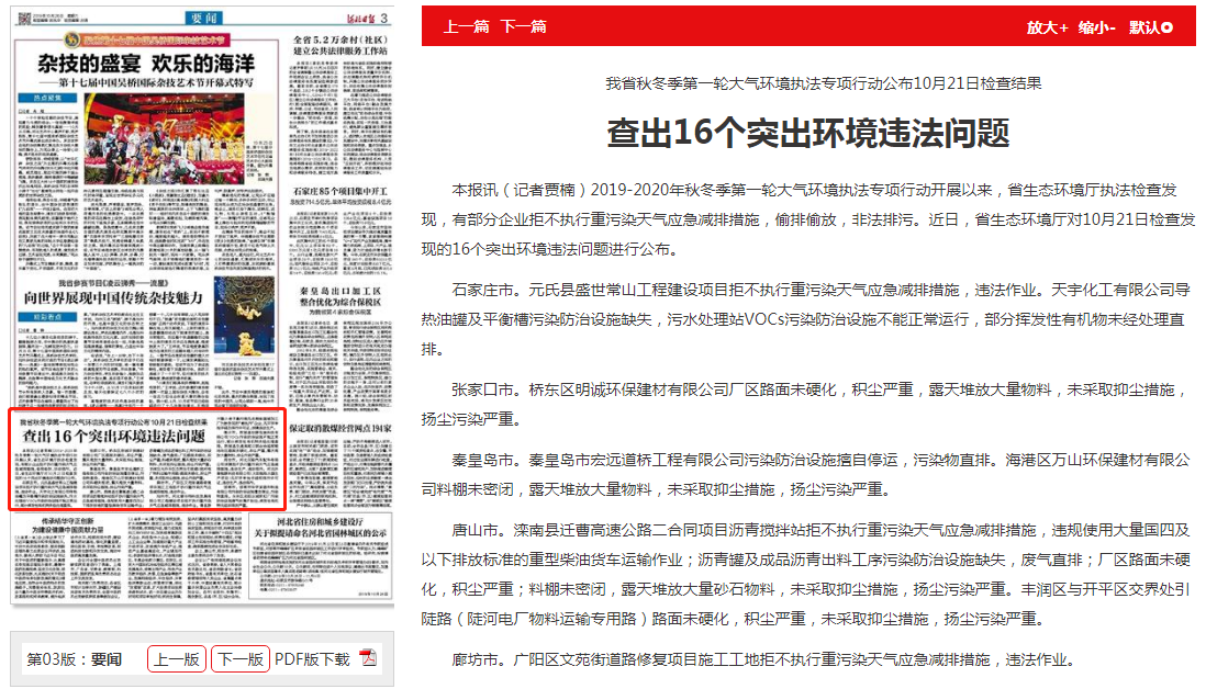 邢台市。河北双聪汽车配件有限公司涉嫌拒不执行重污染天气应急减排措施,违法生产、违法排污。河北沐春能源科技有限公司(太阳能热水器生产项目)无环评审批手续和排污许可证,违法生产、违法排污。