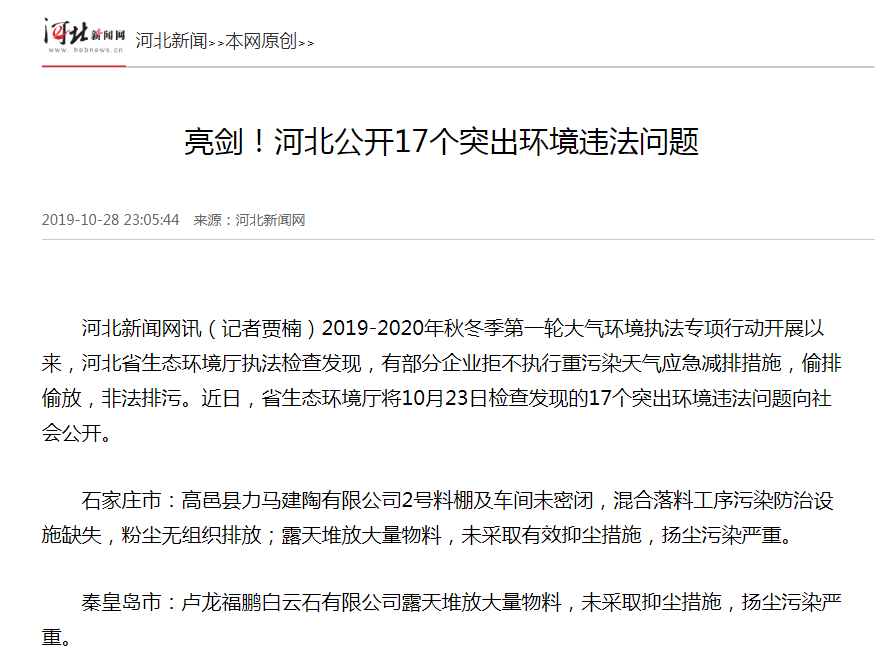 唐山市:恒硕(唐山)科技有限公司批建不符,擅自增加1台抛丸机设备;酸洗工序污染防治设施缺失,废气无组织排放;静电喷涂工序污染防治设施擅自停运,污染物直排。迁西县满兴矿业有限公司上料工序无集尘罩,污染防治设施不能正常运行,粉尘无组织排放严重;露天堆放大量物料,未采取抑尘措施,扬尘污染严重。