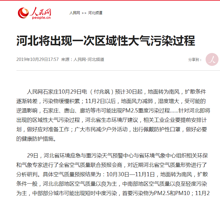 29日,河北省环境应急与重污染天气预警中心与省环境气象中心组织相关环保和气象专家进行了全省空气质量联合预报会商,对近期河北省空气质量形势进行了分析研判。具体空气质量预报结果为:10月30日—11月1日,地面转为南风,扩散条件一般,河北北部地区空气质量以良为主,中南部地区空气质量以良至轻度污染为主,中部部分城市可能出现短时中度污染,首要污染物为PM2.5和PM10;11月2日—6日,地面受南风影响且风力较小,湿度逐渐增高,受夜间至早上可能出现的逆温影响,整体扩散条件较差,河北省北部地区空气质量以良至轻度污染为主,中南部及东部地区空气质量以中至重度污染为主,首要污染物为PM2.5。