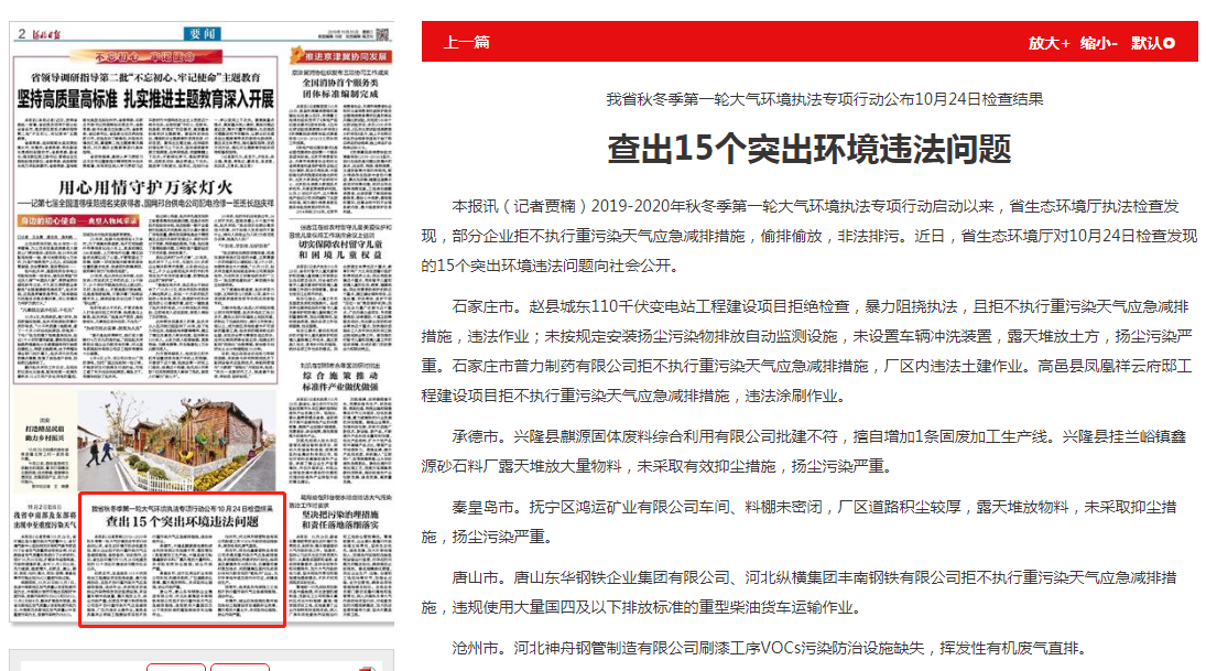 石家庄市。赵县城东110千伏变电站工程建设项目拒绝检查,暴力阻挠执法,且拒不执行重污染天气应急减排措施,违法作业;未按规定安装扬尘污染物排放自动监测设施,未设置车辆冲洗装置,露天堆放土方,扬尘污染严重。石家庄市普力制药有限公司拒不执行重污染天气应急减排措施,厂区内违法土建作业。高邑县凤凰祥云府邸工程建设项目拒不执行重污染天气应急减排措施,违法涂刷作业。