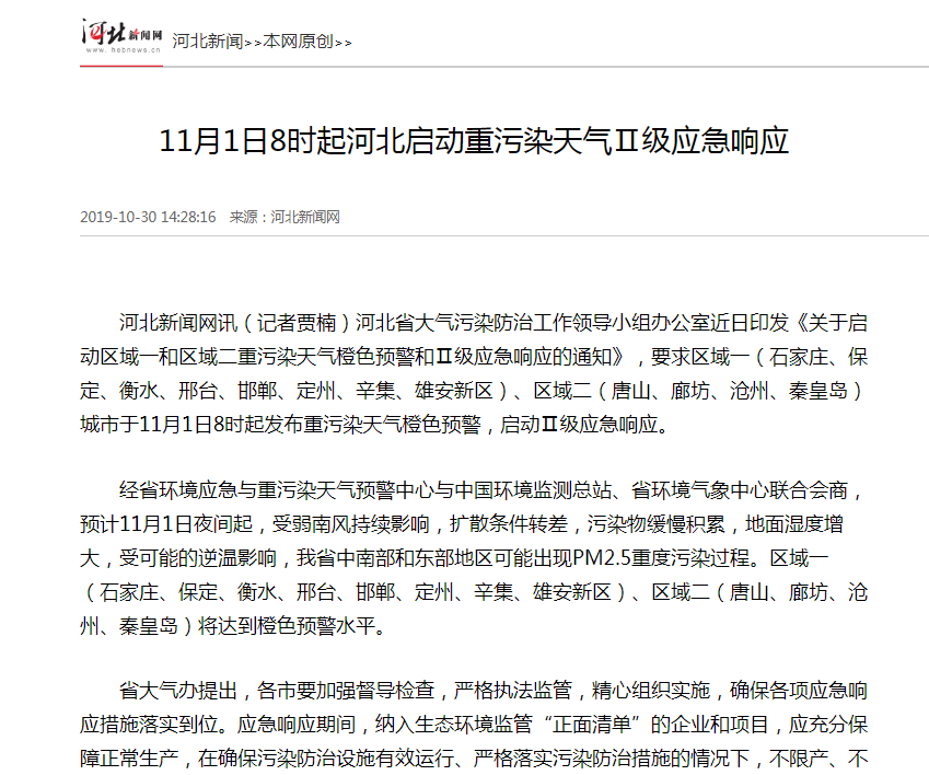 河北新闻网讯(记者贾楠)河北省大气污染防治工作领导小组办公室近日印发《关于启动区域一和区域二重污染天气橙色预警和Ⅱ级应急响应的通知》,要求区域一(石家庄、保定、衡水、邢台、邯郸、定州、辛集、雄安新区)、区域二(唐山、廊坊、沧州、秦皇岛)城市于11月1日8时起发布重污染天气橙色预警,启动Ⅱ级应急响应。
