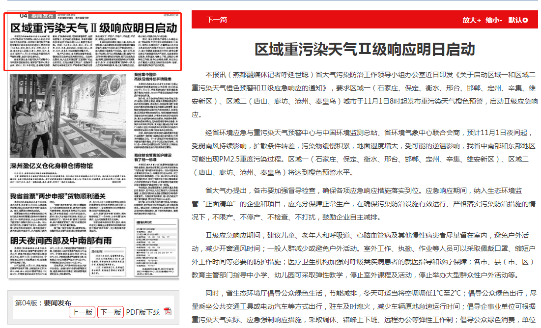 本报讯(燕都融媒体记者呼延世聪)省大气污染防治工作领导小组办公室近日印发《关于启动区域一和区域二重污染天气橙色预警和Ⅱ级应急响应的通知》,要求区域一(石家庄、保定、衡水、邢台、邯郸、定州、辛集、雄安新区)、区域二(唐山、廊坊、沧州、秦皇岛)城市于11月1日8时起发布重污染天气橙色预警,启动Ⅱ级应急响应。
