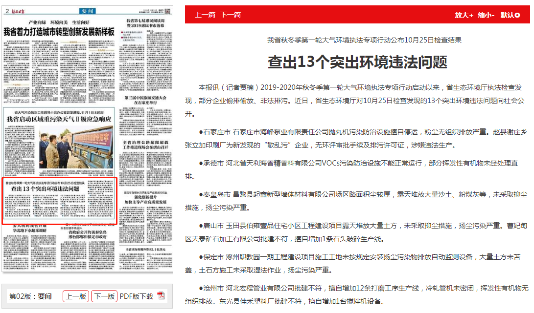●石家庄市 石家庄市海峰泵业有限责任公司抛丸机污染防治设施擅自停运,粉尘无组织排放严重。赵县谢庄乡张立加印刷厂为新发现的“散乱污”企业,无环评审批手续及排污许可证,涉嫌违法生产。