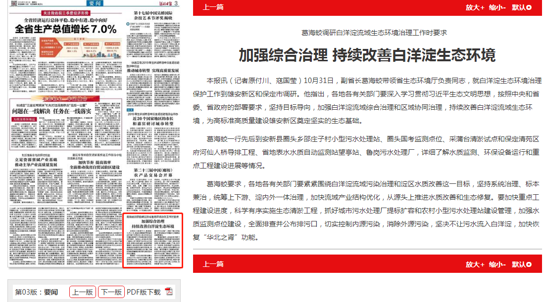 葛海蛟要求,各地各有关部门要紧紧围绕白洋淀流域污染治理和淀区水质改善这一目标,坚持系统治理、标本兼治,统筹上下游、淀内外一体治理,加快流域产业结构优化,从源头上推进水质改善和生态修复。要加快重点工程建设进度,科学有序实施生态清淤工程,抓好城市污水处理厂提标扩容和农村小型污水处理站建设管理,加强水质监测点位建设,全面排查并公布排污口,切实控制内源污染,消除外源污染,坚决不让污水流入白洋淀,加快恢复“华北之肾”功能。