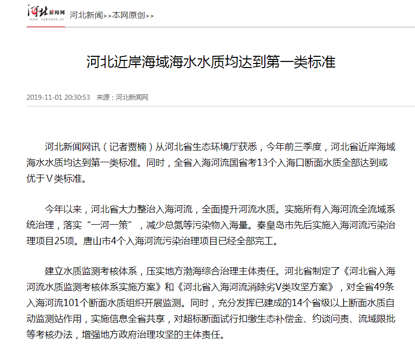 河北新闻网:河北近岸海域海水水质均达到第一类标准