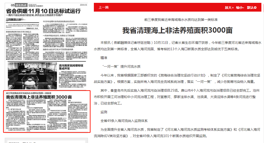 今年以来,我省根据国家三部委印发的《渤海综合治理攻坚战行动计划》,制定了《河北省渤海综合治理攻坚战实施方案》。根据方案,实施所有入海河流全流域系统治理,落实“一河一策”,减少总氮等污染物入海量。