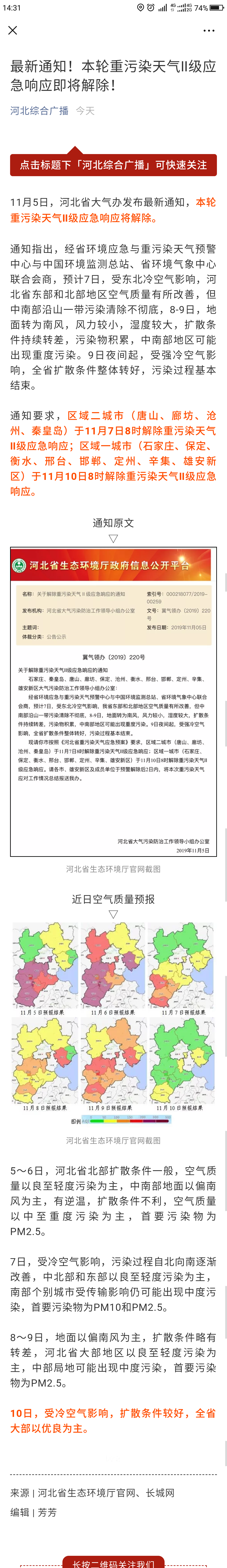 河北综合广播微信: 最新通知!本轮重污染天气Ⅱ级应急响应即将解除!