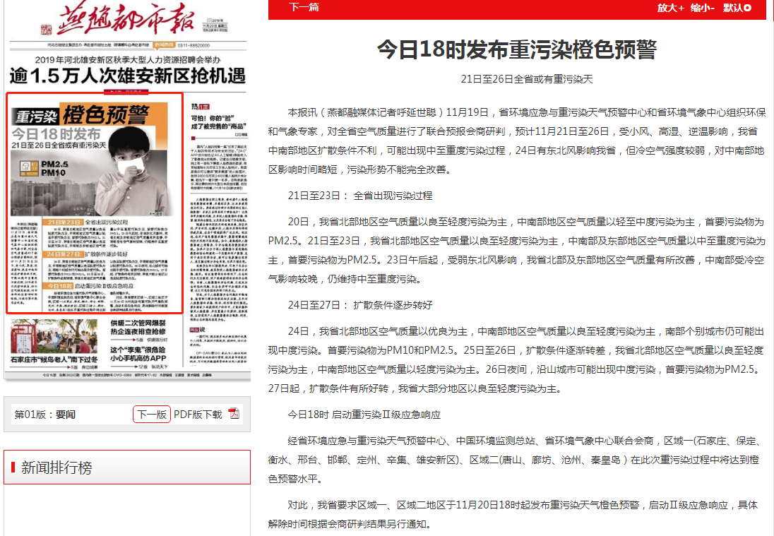 对此,我省要求区域一、区域二地区于11月20日18时起发布重污染天气橙色预警,启动Ⅱ级应急响应,具体解除时间根据会商研判结果另行通知。