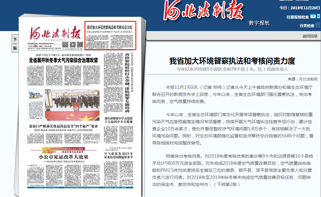 我省突出考核问责。对2018年度考核优秀的衡水等9个市和沽源县等10个县给予总计9800万元资金奖励。对未完成2018年度空气质量改善目标,空气质量综合指数和PM2.5年均浓度排名全省后三位的唐县、顺平县、滦平县党政主要负责人和分管负责人进行问责。对2018年至2019年秋冬季未完成空气质量改善目标任务、问题突出的保定市、廊坊市和定州市,以及唐县、望都县、保定市清苑区、霸州市和廊坊市广阳区政府主要或分管负责人予以责任追究。坚持每月通报考核,对5个设区市政府和79个县(市、区)党委或政府负责人进行约谈,对11个县(市、区)实施区域限批。1至9月份,共奖惩市、县资金5080万元。