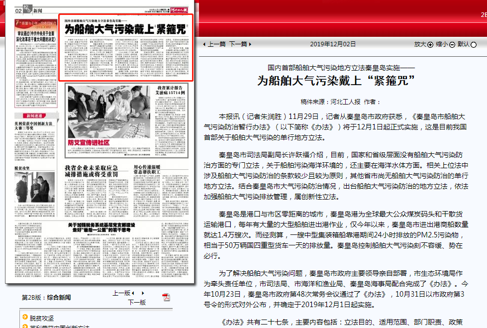 国内首部船舶大气污染地方立法秦皇岛实施——
