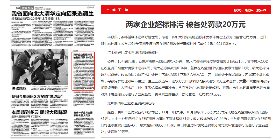经查,唐山市蓝海实业有限公司已于11月13日关停。10月份以来,该公司废气污染物在线监测数据累计超标31天,其中焦炉烟囱烟尘在线监测日均值浓度累计超标31天,最大超标倍数为1.65倍,焦炉烟囱氮氧化物在线监测日均值浓度累计超标4天,最大超标倍数为0.15倍。唐山市生态环境局迁安市分局对其环境违法行为进行了立案查处,处罚款20万元。