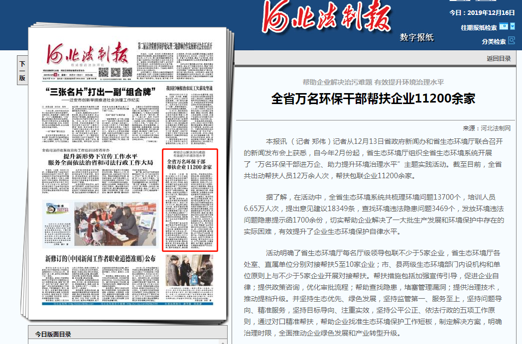 河北法制报:全省万名环保干部帮扶企业11200余家