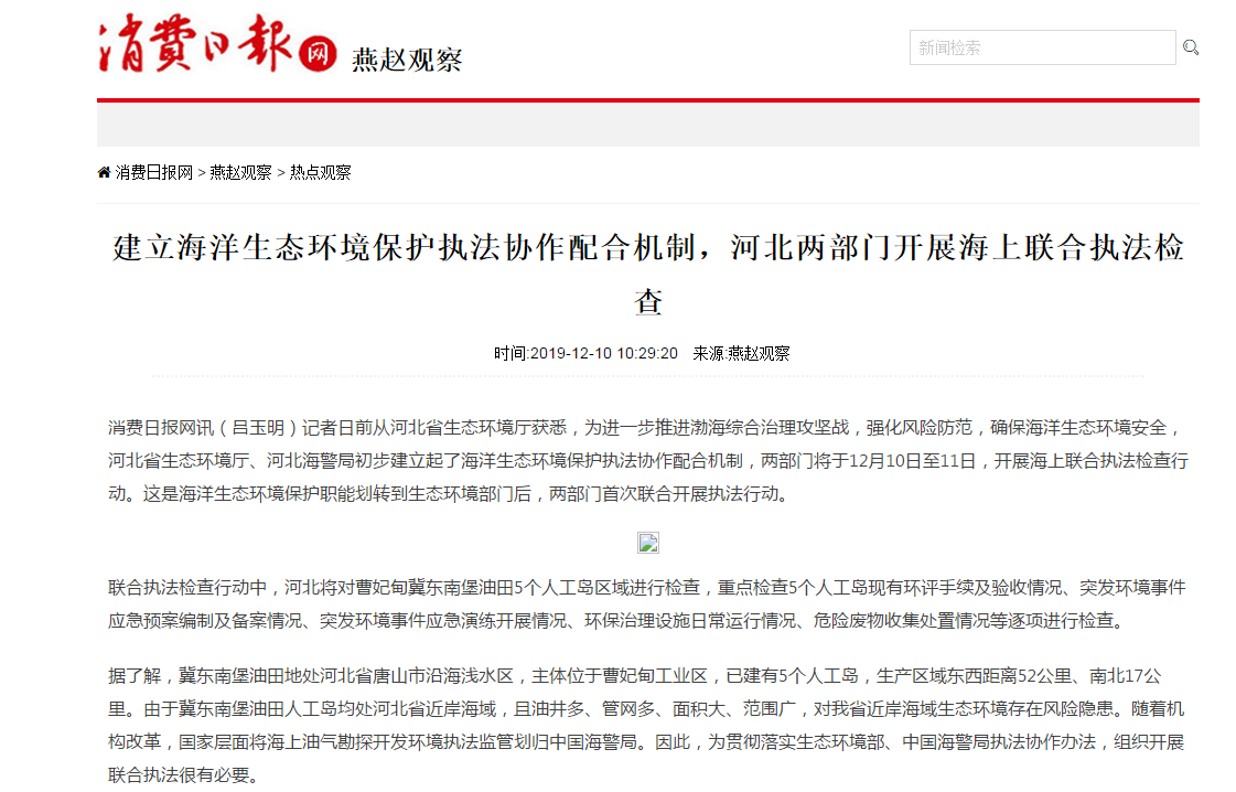 据了解,冀东南堡油田地处河北省唐山市沿海浅水区,主体位于曹妃甸工业区,已建有5个人工岛,生产区域东西距离52公里、南北17公里。由于冀东南堡油田人工岛均处河北省近岸海域,且油井多、管网多、面积大、范围广,对我省近岸海域生态环境存在风险隐患。随着机构改革,国家层面将海上油气勘探开发环境执法监管划归中国海警局。因此,为贯彻落实生态环境部、中国海警局执法协作办法,组织开展联合执法很有必要。