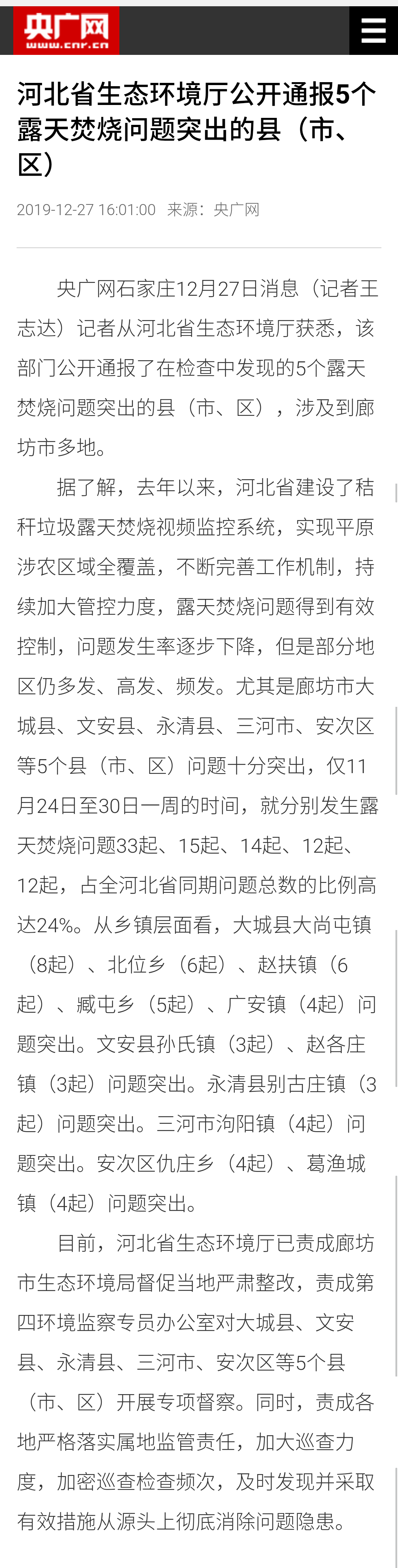 河北广播电视台冀时客户端: 河北公开通报5个露天焚烧问题突出的县(市、区)