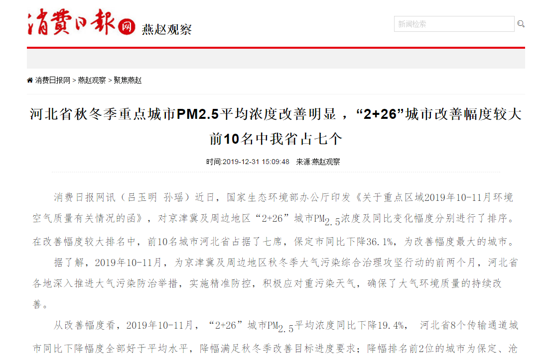 消费日报网讯(吕玉明 孙瑶)近日,生态环境部办公厅印发《关于重点区域2019年10-11月环境空气质量有关情况的函》,对京津冀及周边地区“2+26”城市PM2.5浓度及同比变化幅度分别进行了排序。在改善幅度较大排名中,前10名城市河北省占据了七席,保定市同比下降36.1%,为改善幅度最大的城市。