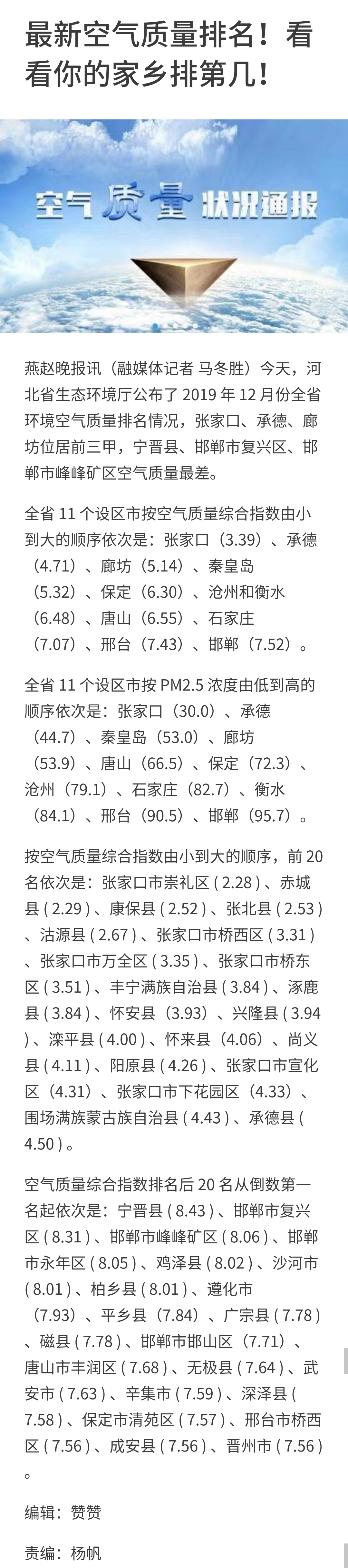 燕赵晚报融媒体:最新空气质量排名!看看你的家乡排第几!