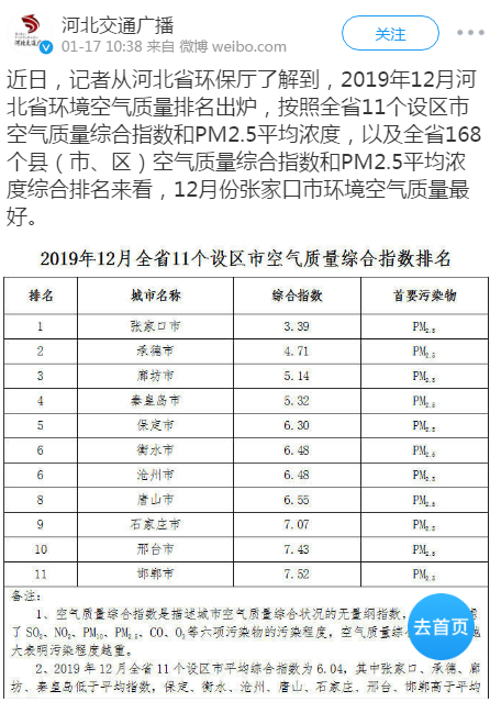 河北交通广播微博:东京热 公布 2019 年 12 月份全省环境空气质量排名