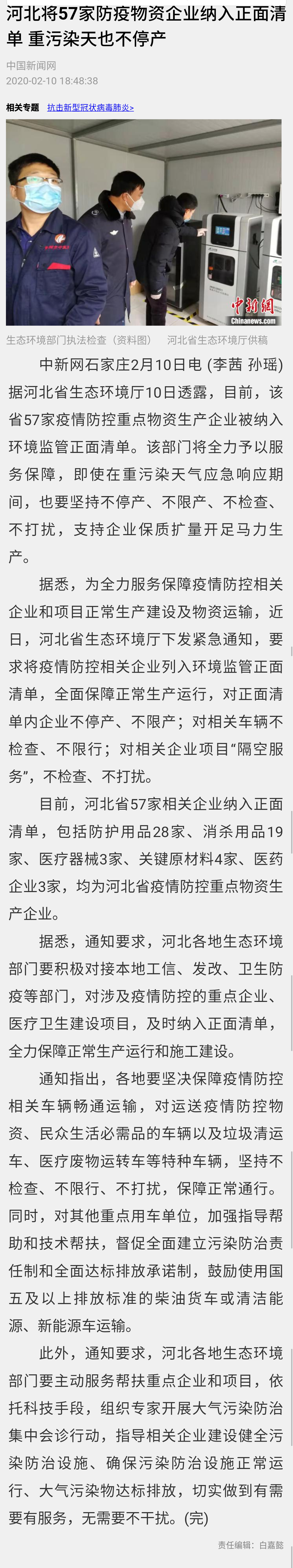 中国新闻网: 河北将57家防疫物资企业纳入正面清单 重污染天也不停产